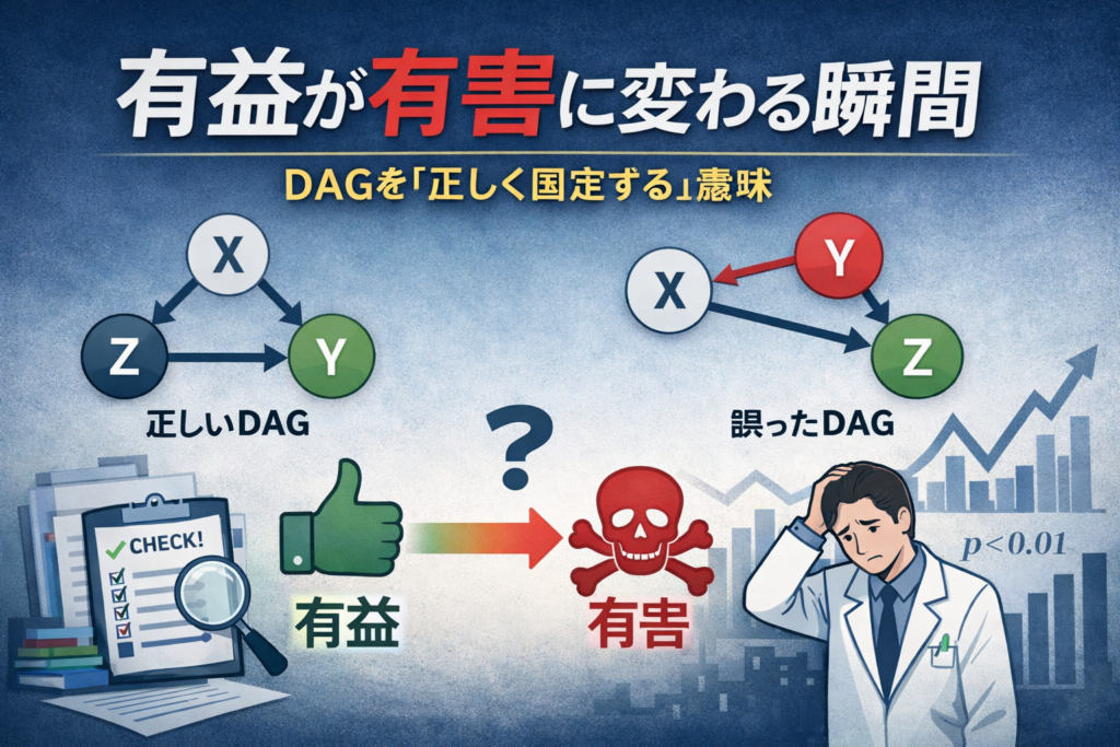 そして一番の落とし穴が、固定(条件づけ)です。現場のデータは往々にして偏ります。クレームが出た案件だけ、退職者だけ、炎上したプロジェクトだけ。そこだけを見て「人が悪い」「現場が弱い」と結論づけると、選択バイアスで因果が逆転します。DAGは「どこに条件づけてしまったか」を明示できるので、“反省会をやった気になって終わる”を減らせます。