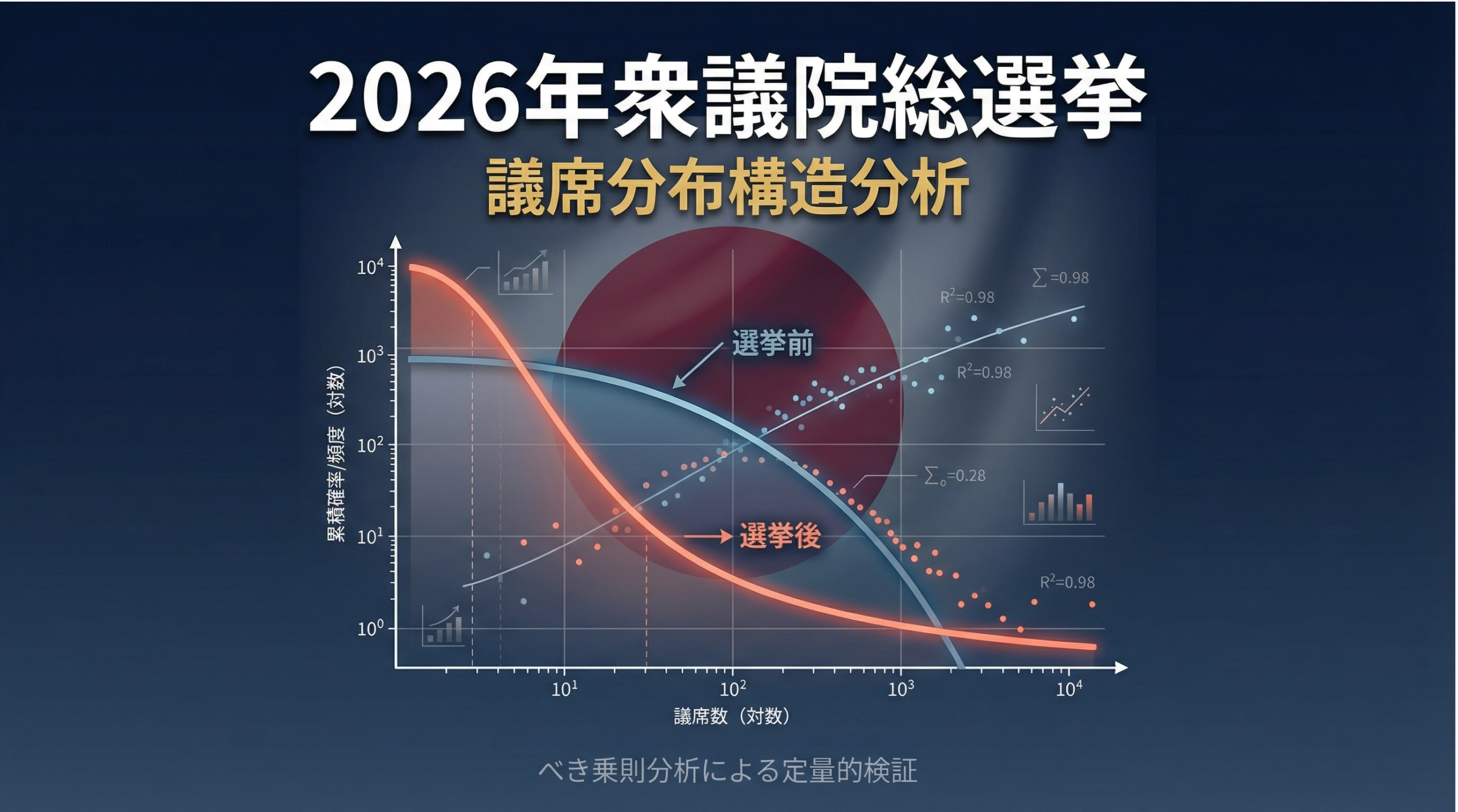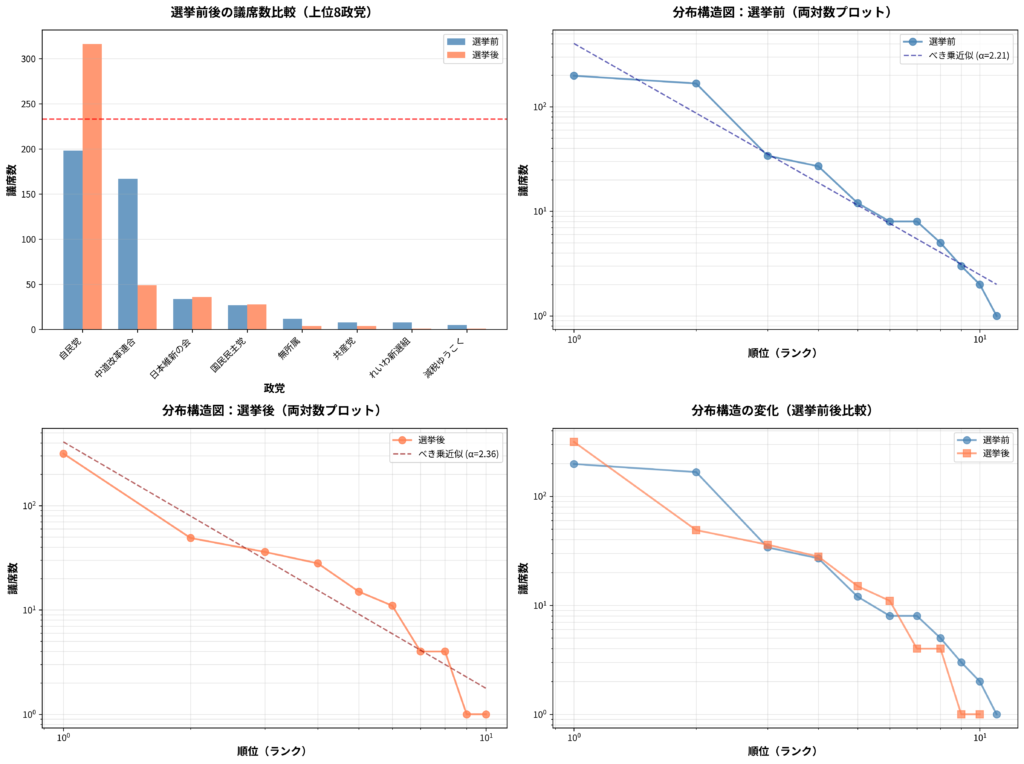 さらに、べき乗則分析では、第1党が理論値を大きく上回り、第2党以下が下回る“構造的歪み”が確認されました。これは、今回の選挙が「勝者総取り」的な帰結を持ち、議会内競争を寡占化へ押しやったことを意味します。