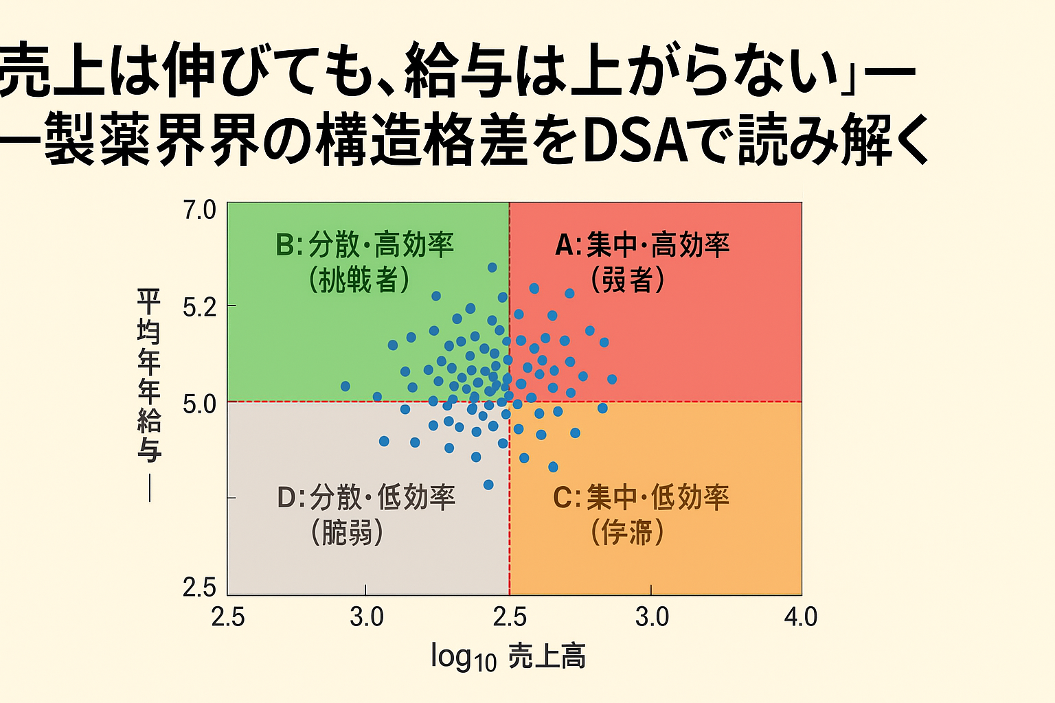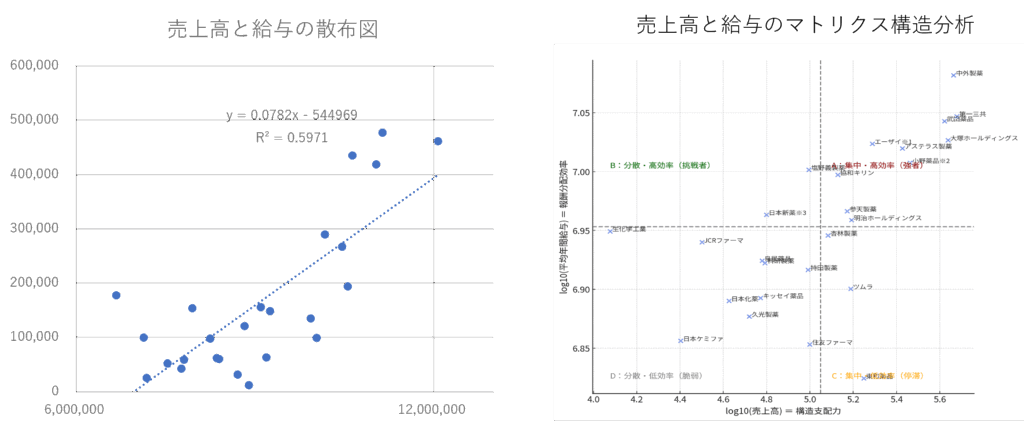製薬業界の売上と給与の関係を、構造可視化手法で分析しました。