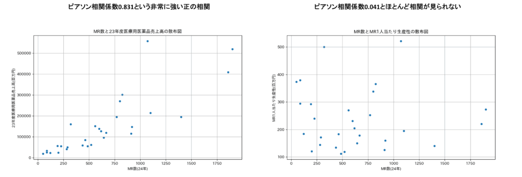 MR数と売上高の間にはピアソン相関係数0.831という非常に強い正の相関が確認されており、MR数を減らせば売上高も減少する可能性が高いことがわかりました。売上高を支えているのは単なる製品力ではなく、MRの活動そのものだという事実は、改めて重視されるべきです。