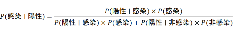 つまり、「陽性」と出たときにその人が本当に感染している確率(P(感染|陽性))を求めるには、