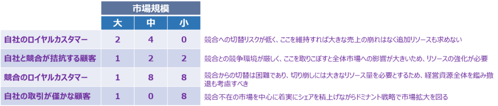 市場が縮小し競争環境は一層厳しさを増していることから、市場規模に自社の競争優位性を加えた二軸で顧客分類を行い、自社が持つ経営資源を考慮したうえで適切な優先順位とリソース配分を行うことが重要です。