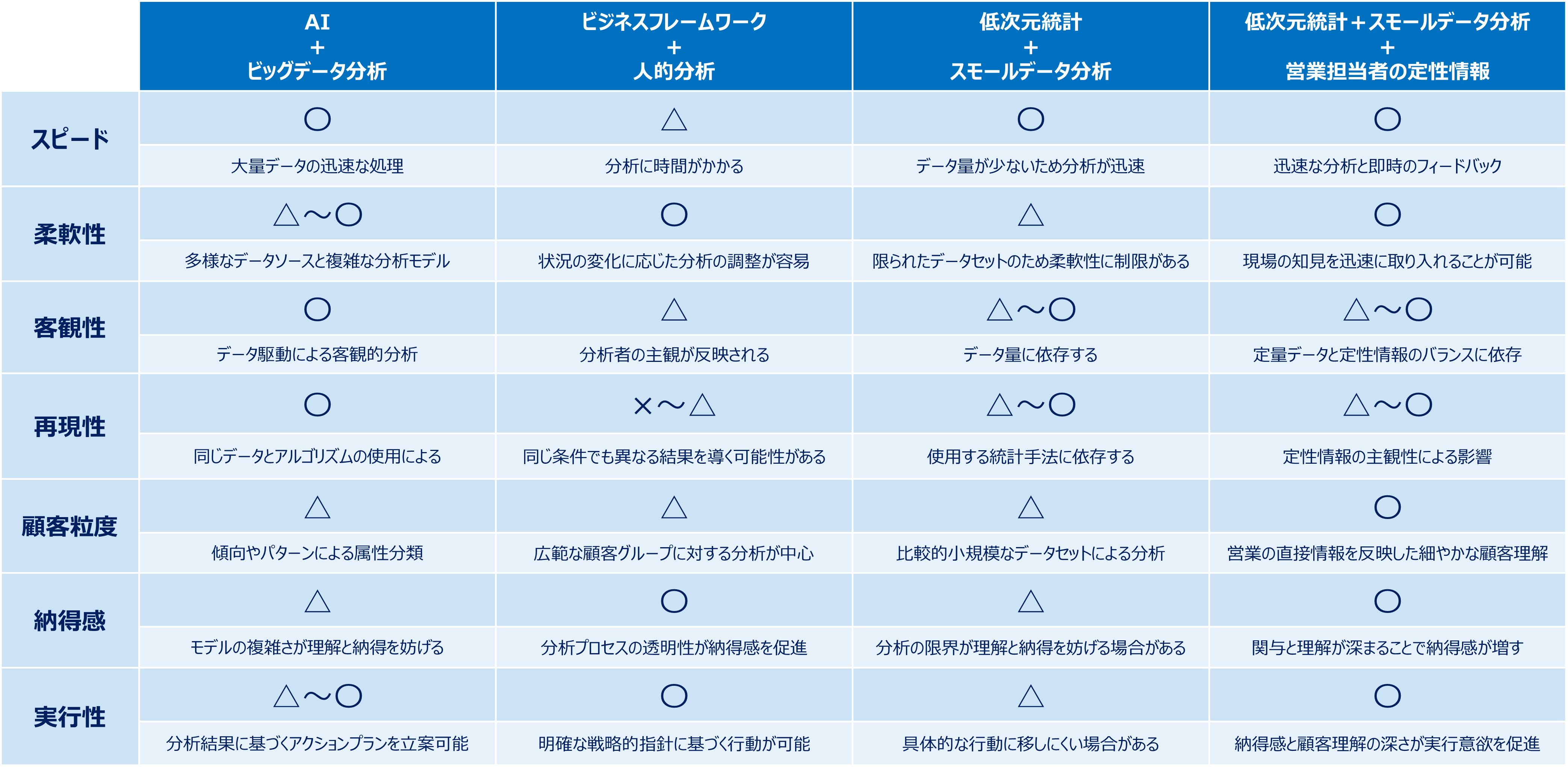 ④では、低次元統計によるスモールデータ分析と営業担当者からの定性情報を組み合わせることで、速度、柔軟性、そして顧客に対する深い理解をバランス良く実現することができます。