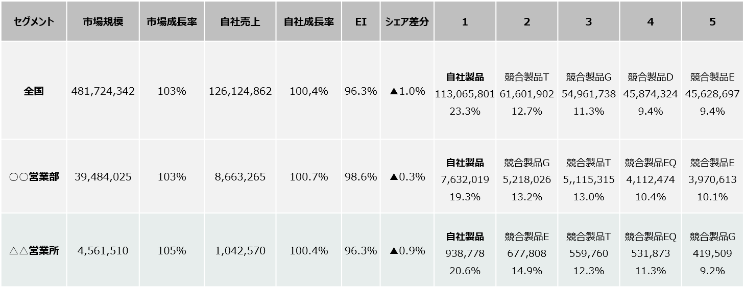 全社と営業部、そして営業所の3つのセグメントの実績データからどのようなことが読み取れるでしょうか。