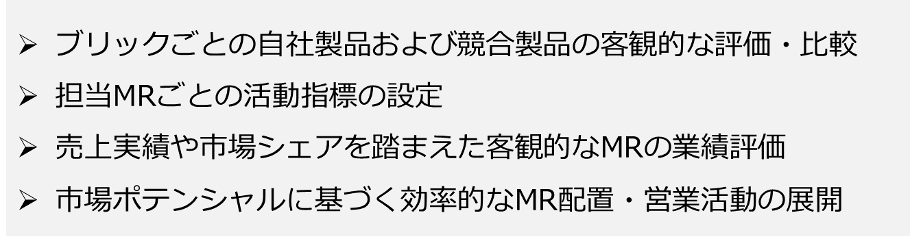 DDDを用いれば、市場のポテンシャルや競合製品のマーケットシェアから、効果的なエリア・マーケティングの実施や、MR 配置戦略・販売計画の立案に活用することが出来ます。