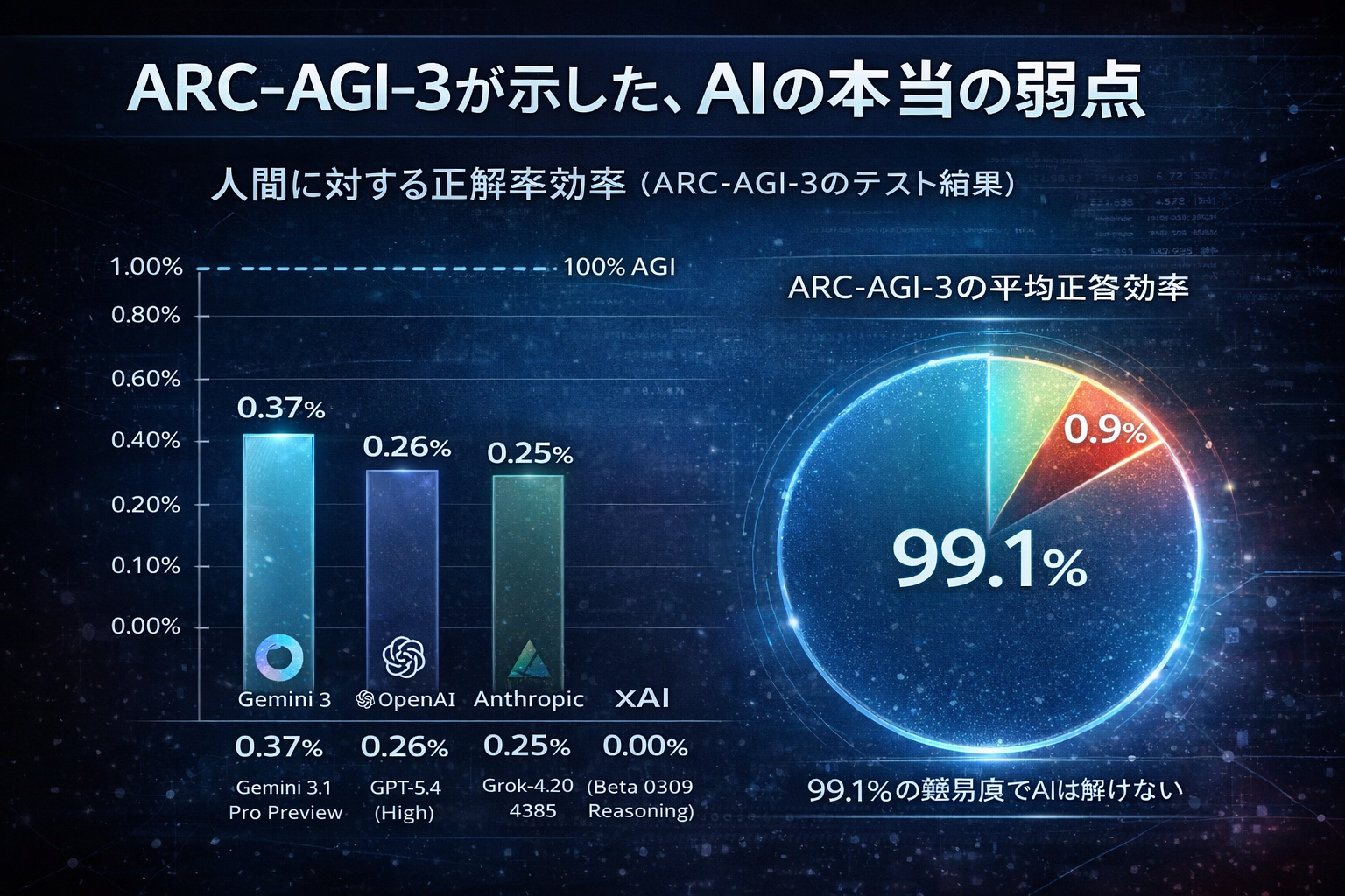 AIの”汎用的な推論能力”を測るテストに、「ARC-AGI(ARC AGI Benchmark)」があります。現在はバージョン3まで公開されています。生成AIは、要約、翻訳、文章生成、コード作成といった領域で驚異的な進歩を遂げました。ところが、ARC-AGIは、そうした進歩とは別の次元でAIの限界を照らしています。