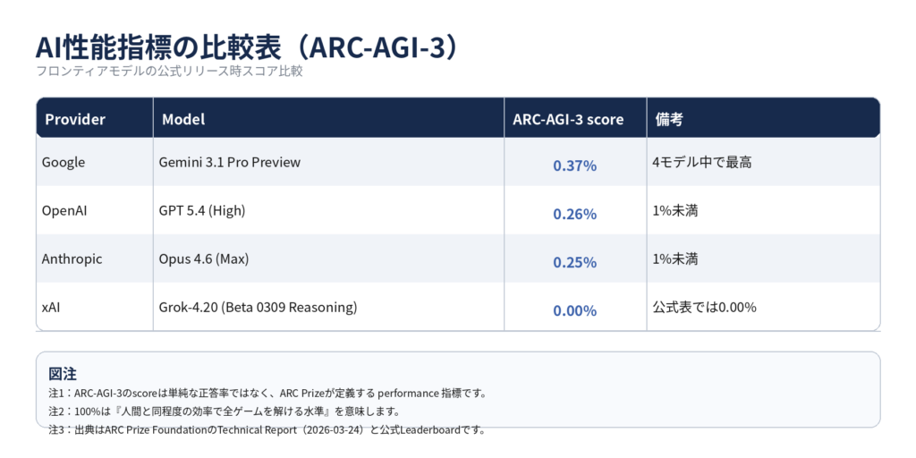ARCは、知識量や言語流暢性ではなく、最小限の手がかりから新しいルールを見抜き、未知の課題へ適応する流動性知能を測るために設計されたベンチマークです。François Cholletも、単なるスキルの多寡ではなく、どれだけ効率よく新しい課題を学習・一般化できるかこそが知能の核心だと論じています。 ARC Prizeの説明でも、ARC-AGI-1から2、さらに3へ進むにつれて、評価の焦点は静的パズルから、未知環境の探索、目標の推定、世界モデルの形成、継続的適応へと拡張されています。つまり、問われているのは、答えを知っているかではなく、構造を見抜けるかです。
